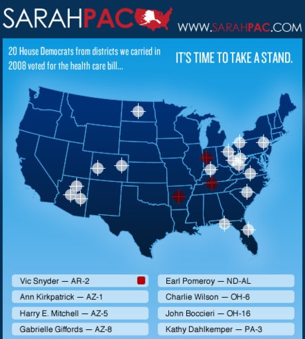 Consider the article’s piece de resistance: Sarah’s Palin’s crosshairs, targeting Democrats in Congress who committed the unpardonable offense of supporting healthcare reform. There has been probably more outrage over the reaction to this ad than there was over the ad itself, with many declaring it the ultimate mark of incivility to suggest that it may have been one element that inspired the Tuscon gunman. But to assume flatly that it wasn’t is to divorce it from the context of the eliminationist extremism (and gun glorification) that produced it. It may be incorrect to think that the crosshaired map exerted any influence on the shooter’s unbalanced brain, but it’s certainly not unreasonable to consider it a possibility. Indeed, not long before she was shot, Congresswoman Gabrielle Giffords (one of Sarah’s “targets”) expressed concern about that very thing. And she wasn’t just being paranoid; her office already had been vandalized.