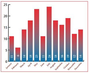 That was near the end of June, which means that the first half of the year had the gun law in effect and the second half didn’t. While I don’t have a monthly breakdown for general crime in D.C. in 2008, the breakdown for homicide is depicted in this chart from the metropolitan police department’s website: