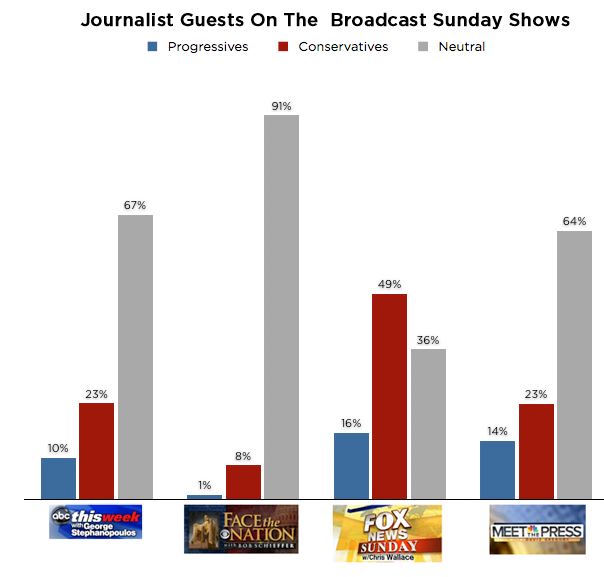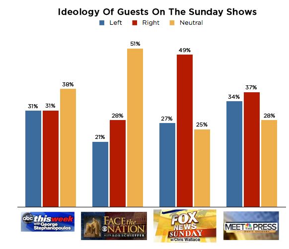 The report examines the four leading Sunday morning political talk shows: ABC’s This Week, CBS’ Face the Nation, Fox’s Fox News Sunday and NBC’s Meet the Press. And it examines each of them for six types of ideological bias: ideology of guests, ideology of interviewees, dominant ideology of panels, ideology of elected and administration official guests, ideology of elected and administration official solo interviewees, and ideology of journalist guests. (Note that there is some overlap.)