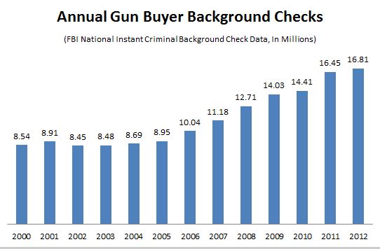 Another trick the folks at TTAG tried was presenting a chart of background checks, like the one reproduced above, as evidence of increased gun ownership. But while background checks might be a pretty good indicator of firearm purchases, they don’t necessarily reflect the number of purchasers.