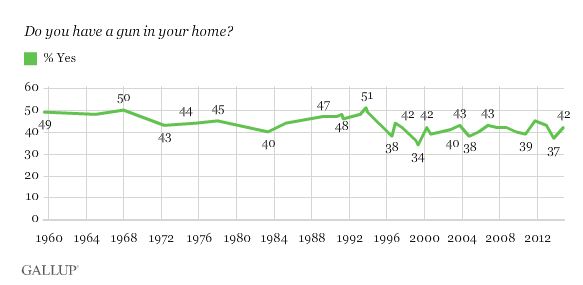 In one post, TTAG zeroes in on Gallup’s tracking, which seems to be a bit of an outlier, and the writer brandishes three selective years to give the impression that Gallup shows gun ownership to be on the rise. But in fact if you look at the big picture — i.e., a graph of Gallup’s numbers since it began surveying the issue in 1960 — you get a rather different impression: