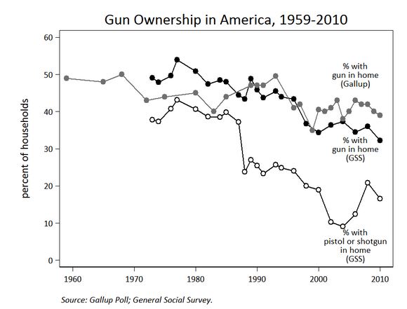 Again, such a conclusion is at odds with the long-term trend. Look again at those charts showing the decline in gun ownership. It began long before Barack Obama became the wingers’ demon du jour. It went on during the terms of Ronald Reagan and both Bushes, who were — notwithstanding the elder Bush’s renunciation of his NRA membership — much cozier with the gun culture.