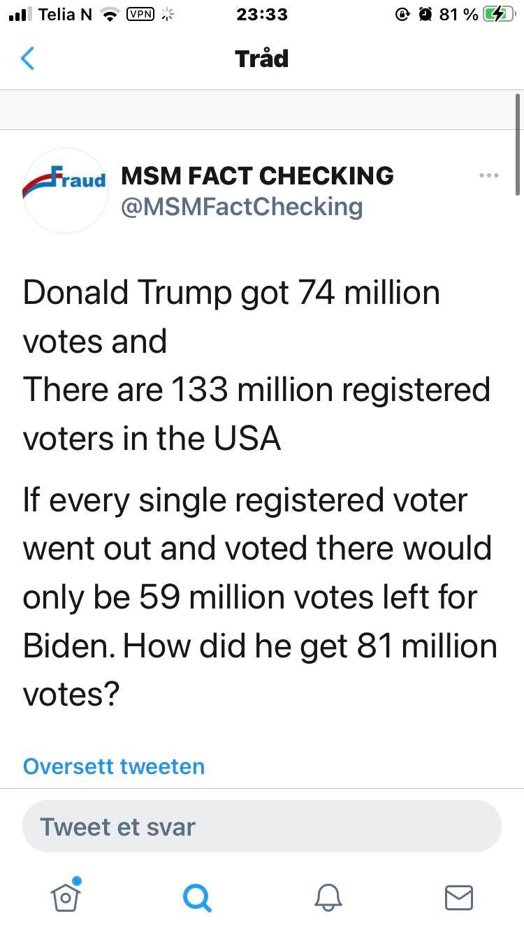 First of all, the numbers are way off. Or at least one of them. In fact, there’s no indication of just where that supposed total of 133 million voters came from — probably from deep in someone’s rectum. We don’t even know yet exactly how many registered voters there were in 2020. But in 2016, there were over 157 million, with over 137 million participating. This time, there’s little doubt that the number of registered voters was considerably higher. And we already know that over 159 million of them voted.