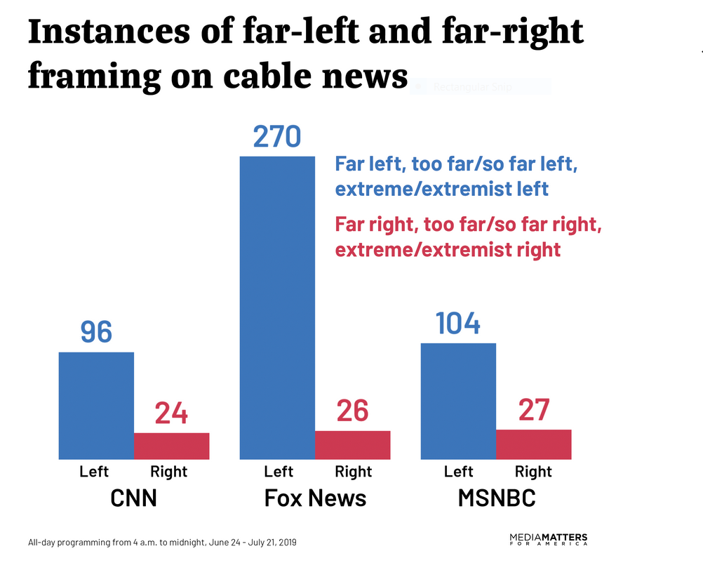 Finally, here is perhaps the most illuminating study of all. It tracked how frequently the same 3 cable networks mentioned above (2 of which, remember, are reputed to be decidedly “liberal”) used terms like “far left” versus “far right” during a one-month span.