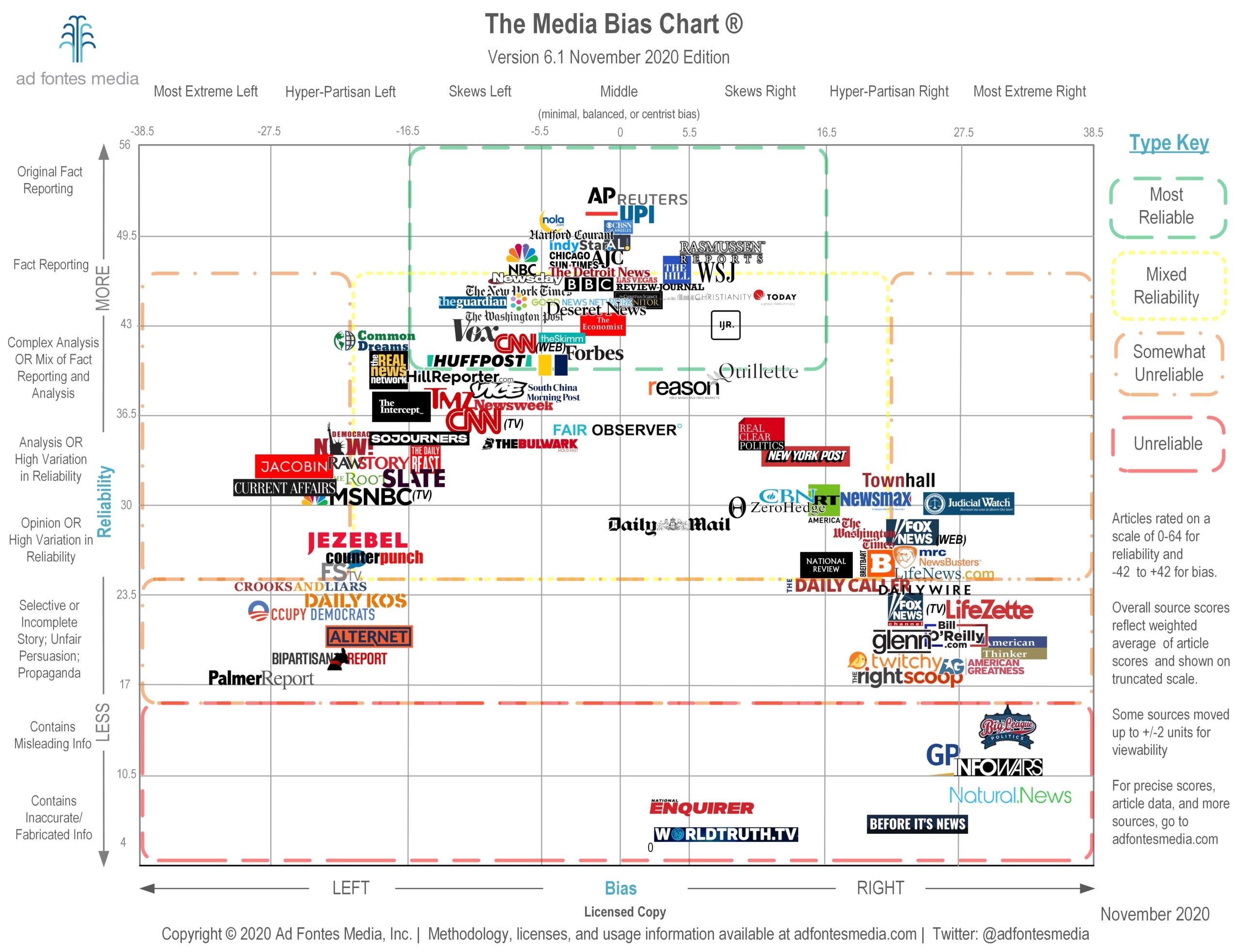 Perhaps the most comprehensive and systematic analysis out there can be found at Vanessa Otero’s site Ad Fontes Media. (We’ve mentioned, and praised, Otero’s work before.) This is a very impressive project that not only thoroughly and systematically tracks both media bias and media reliability on an ongoing basis, but depicts the findings in a chart (with an interactive version) that reveals the media map at a glance, and provides much more detail for anyone who wants to dive into it.