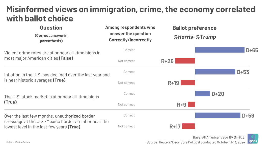 About a month before the election, a Reuters/ Ipsos poll queried voters about their answers to a few questions on the economy, the border, the stock market, and crime. These were questions that were not a matter of opinion, but had definite correct answers; however, the incorrect answer in each case had become much more entrenched in the media narrative. And in each case, Democratic voters were much more likely to provide the correct answer, and Republicans the incorrect answer. Which is hardly surprising; Republicans are much more aligned with the habitual purveyors of misinformation. (The one surprising thing about their campaign was that they hardly touched their customary fire hose of lies about abortion — not even the fallacious premise that banning it is an effective way to prevent it.)