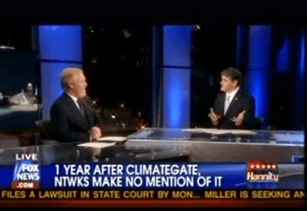 The date was November 19, 2010. The place was the studios of Fox “News” in New York City. The host was Dear Old Sean Hannity. His guest was Brent Bozell of Media Research Center. The topic was climate change. More specifically climate science denial. More specifically still, the so-called “Climategate” non-scandal. And even more specifically still, the so-called “media bias” in (supposedly not) covering it — you know, the old “librulmedia” bit.