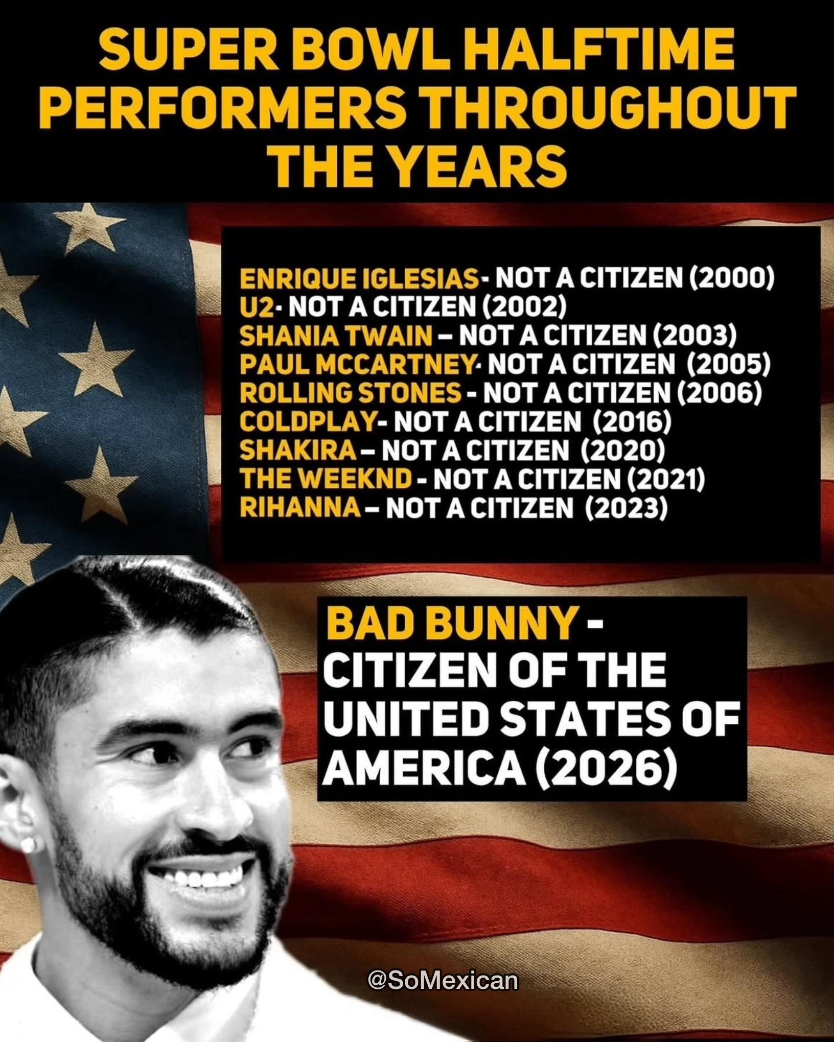 As always, the MAGA Cult had some really, really vital issues to focus on this past week: such as who is performing at the Super Bowl. The selection is even such an outrage that ICE is going to be there too. Oh, never mind– they’re everywhere. You see, the performer, Bad Bunny, raps in Spanish, so there must be something nefarious about the NFL booking him. It’s especially troubling to do things in Spanish around people who are struggling with English, such as former racecar driver Danica Patrick, who clumsily observes that “No songs in English should not be allowed.” After all, if there are no songs not not in English not, then it can only good happen.