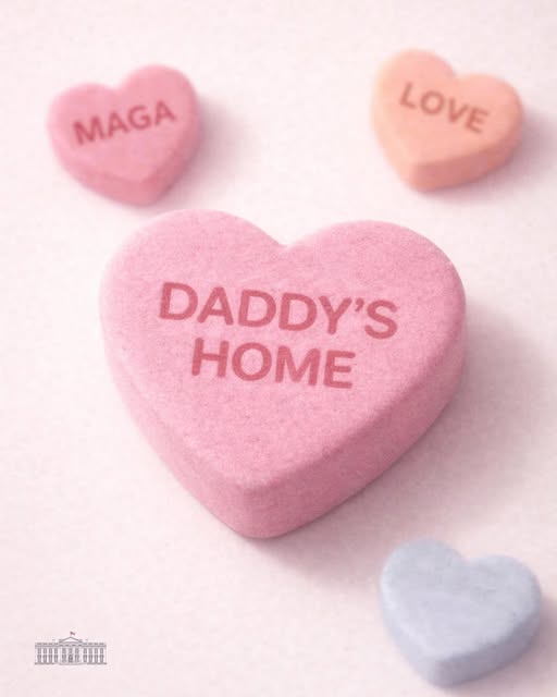 Yes, it’s from the official White House account. On the occasion of Valentine’s Day, that account ran an image of candy hearts with the words “MAGA”, “love” and “Daddy’s home”. Would you like to take three guesses as to whom it was referring as “daddy”?