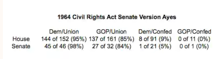 Referring back to the example above of the voting breakdown on the Civil Rights Act, Republicans often broach the topic to “prove” that it is really Republicans and not Democrats who are champions of civil rights (after all, they come to the rescue of poor marginalized billionaires, don’t they?), and it is really Democrats and not Republicans who are racists. Aside from the figures they present being a drastic oversimplification, the upshot they extract from it totally ignores (or denies) the fact that both parties have undergone extreme realignments in recent decades; so comparing either one to the party of the same name in the past is irrelevant.