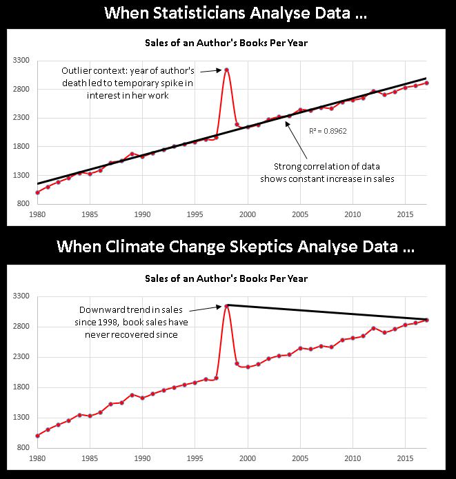 In some data sets, there is a sufficient sample size, but whoever presents the figures only offers a limited range, whether deliberately or not. This is known as cherry picking. The following graphic is an excellent illustration.